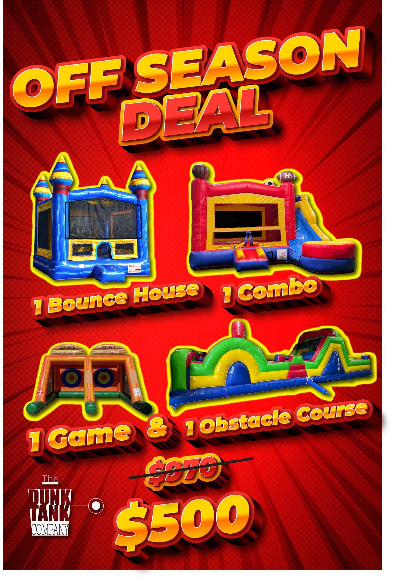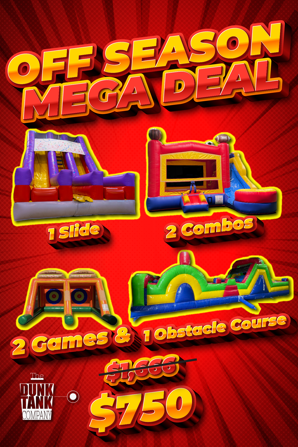 Normally $1666 but in the off season just $750! Or book 2+ events for $650 per event*! Any school that books an Off Season Deal will also receive 15% off one field day or Spring/Summer 2025 rental!*