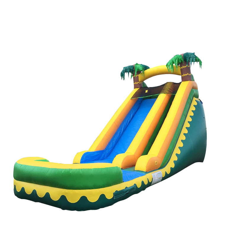 Dive into a world of excitement and tropical vibes with the Tropical Aloha 18 Ft Slide! Whether you're hosting a backyard party or a large-scale event, this inflatable slide is designed to bring a splash of the islands right to your gathering. Its vibrant green and yellow hues, combined with the charming palm tree details, make it a standout attraction that's sure to impress both kids and adults alike. 🌞